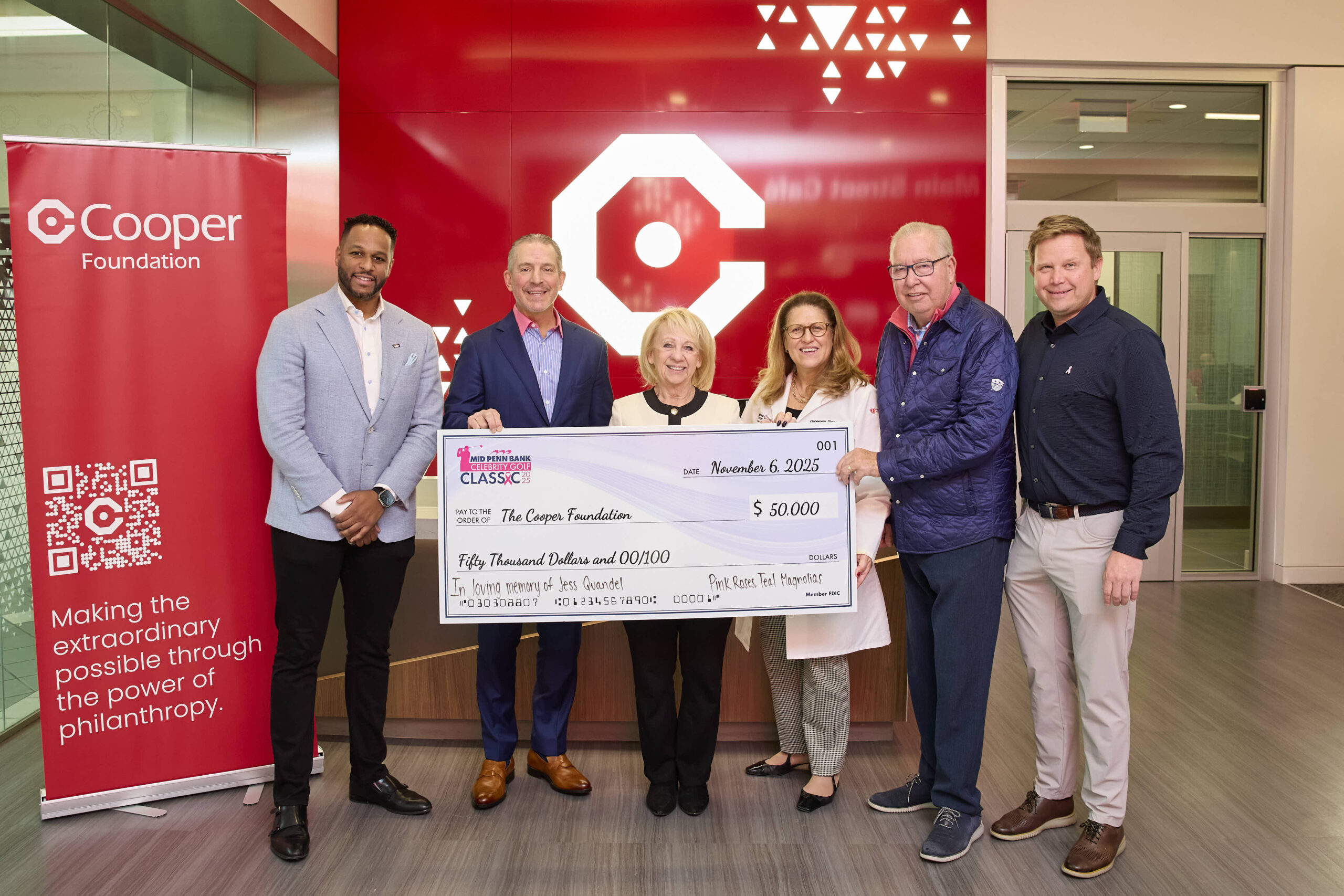 (Moorestown, NJ) – Mid Penn Bank has pledged $1 million to support breast cancer care and research through the Pink Roses Teal Magnolias Fund at MD Anderson Cancer Center at Cooper, in partnership with The Cooper Foundation. As part of this transformational pledge, the Bank recently contributed $50,000 of proceeds raised from its 2025 Mid Penn Bank Celebrity Golf Classic, presented during a special ceremony at Cooper’s Moorestown campus, in loving memory of Jess Quandel.